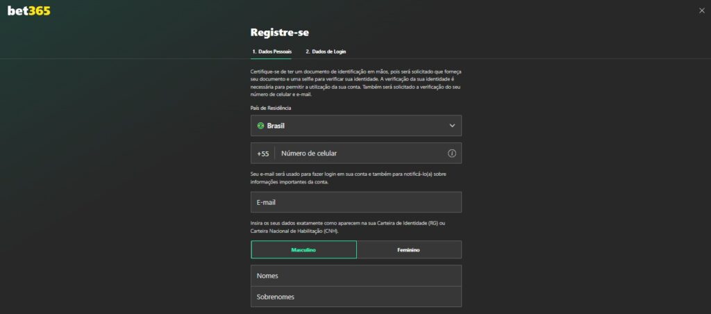 Aceda à plataforma oficial da Bet365 e clique em “Registre-se” no canto superior direito. Insira todos os dados pessoais solicitados.